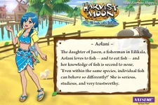 Aolani is one of the ten available marriage candidates for the player to marry in Harvest Moon: The Winds of Anthos.