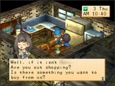 Lumber, Turnip, Potato, Cucumber, Strawberry, Cabbage, Tomato, Onion, Pumpkin, Pineapple, Eggplant, Carrot, Sweet Potato, Spinach, Green Pepper, Moondrop Flower, Toy Flower, Apple, Bamboo Shoot, Wild Grape, Truffle, Ketchup Recipe, Egg, Mayonnaise, Milk, Cheese, Yarn Ball, SUGDW Apple, Bodigizer, Bodigizer XL, Turbojolt, Turbojolt XL, Small Fish, Fruit Juice, Mixed Juice, Pumpkin Pudding, Sweet Potato (dish), Butter, Mushroom Rice, Chirashi Sushi, Sashimi, Cookie, Ice Cream, Cake, Golden Egg, Chocolate Cookie, Chocolate Cake, Bandage, Fruit Latte, Mixed Latte, Ketchup, Winter Lumber