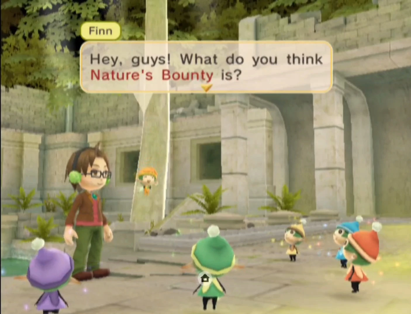 At the Goddess' Pond, Finn asks the other Harvest Sprites about how to get Nature's Bounty. One by one, each Harvest Sprite gives a suggestion as to what they think is required.[1]