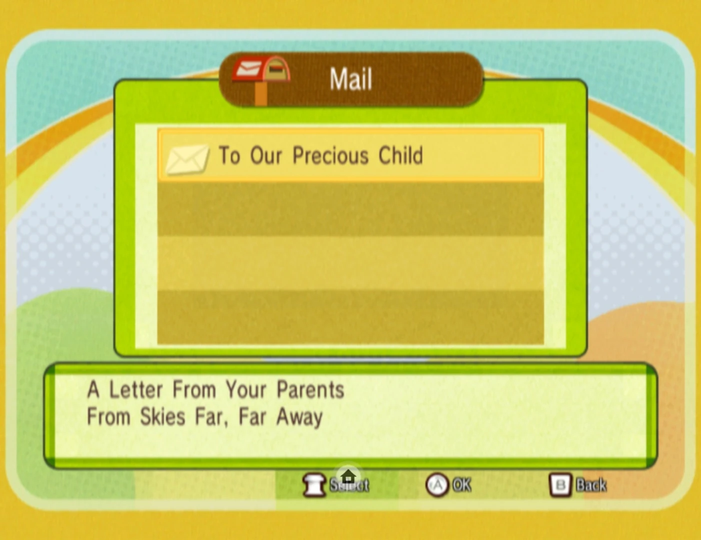 After receiving the gift that your previous character gave to their child, you'll notice that there is a letter in the mailbox. The letter is from your parents, likely a nod to your previous player character's family.