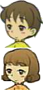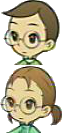 Short hair with mischievous-looking face. Wears an orange shirt beneath sleeveless blue pinafore.